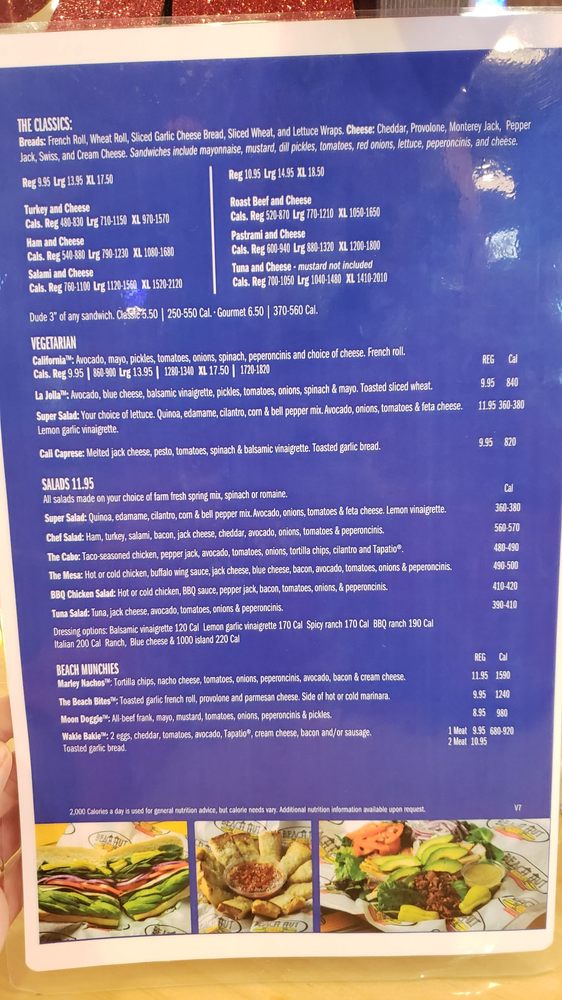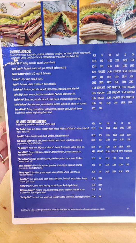 The highlights include deliciously crafted options like the Surfin' Bird—a savory mix of turkey, avocado, and bacon, or the indulgent Surfin' Cow featuring roast beef and cream cheese. For a plant-based twist, try the California sandwich loaded with fresh veggies and your choice of cheese.
